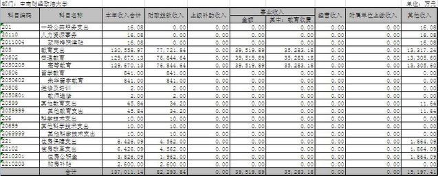 按照支出功能科目划分,一般公共服务支出16.08万元,占总支出的0.013%;教育支出116,076.19万元,占总支出的94.51%;科学技术支出1.17万元,占总支出的0.001%;节能环保支出300万元,占总支出的0.244%;住房保障支出6,426.09万元,占总支出的5.232%。
