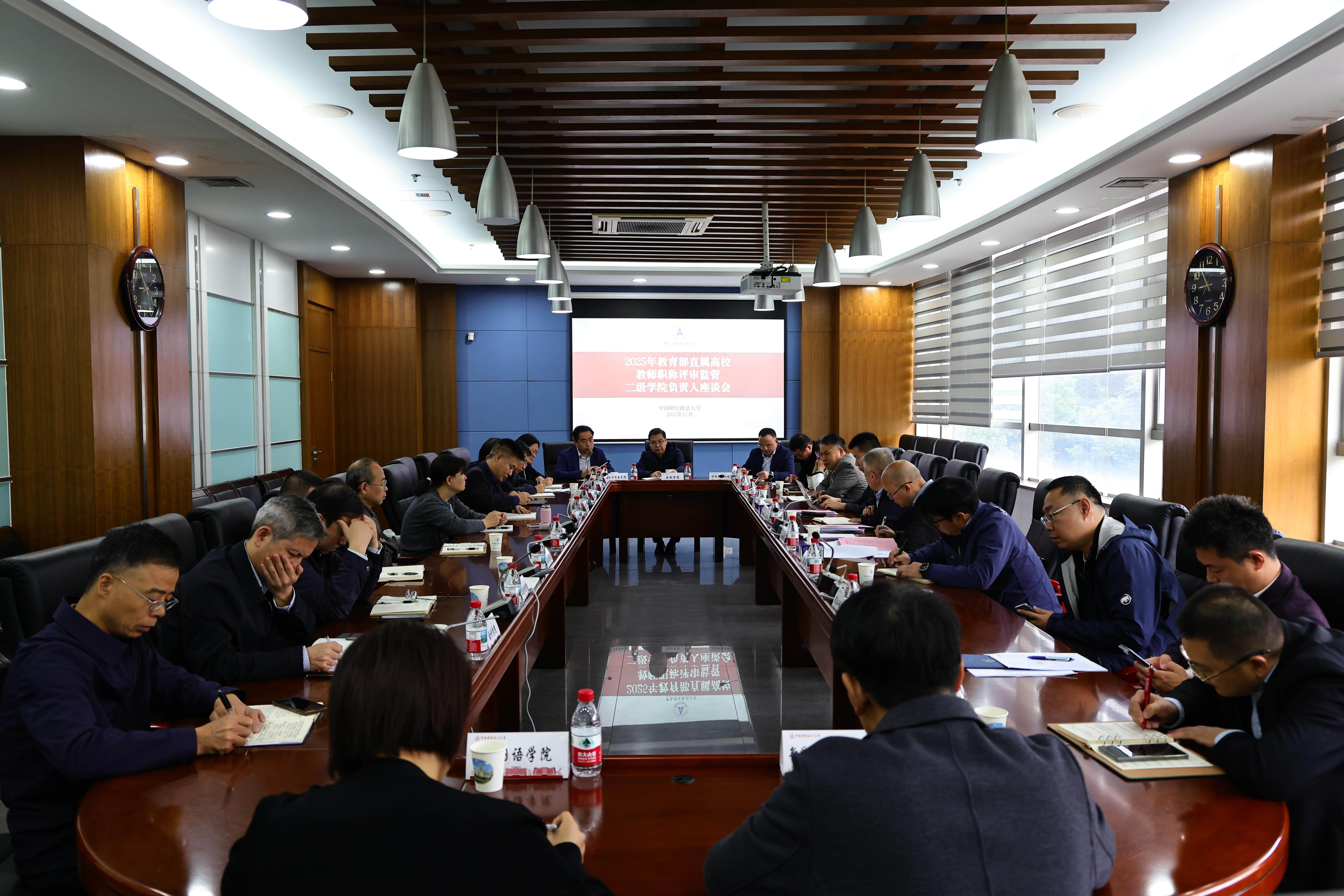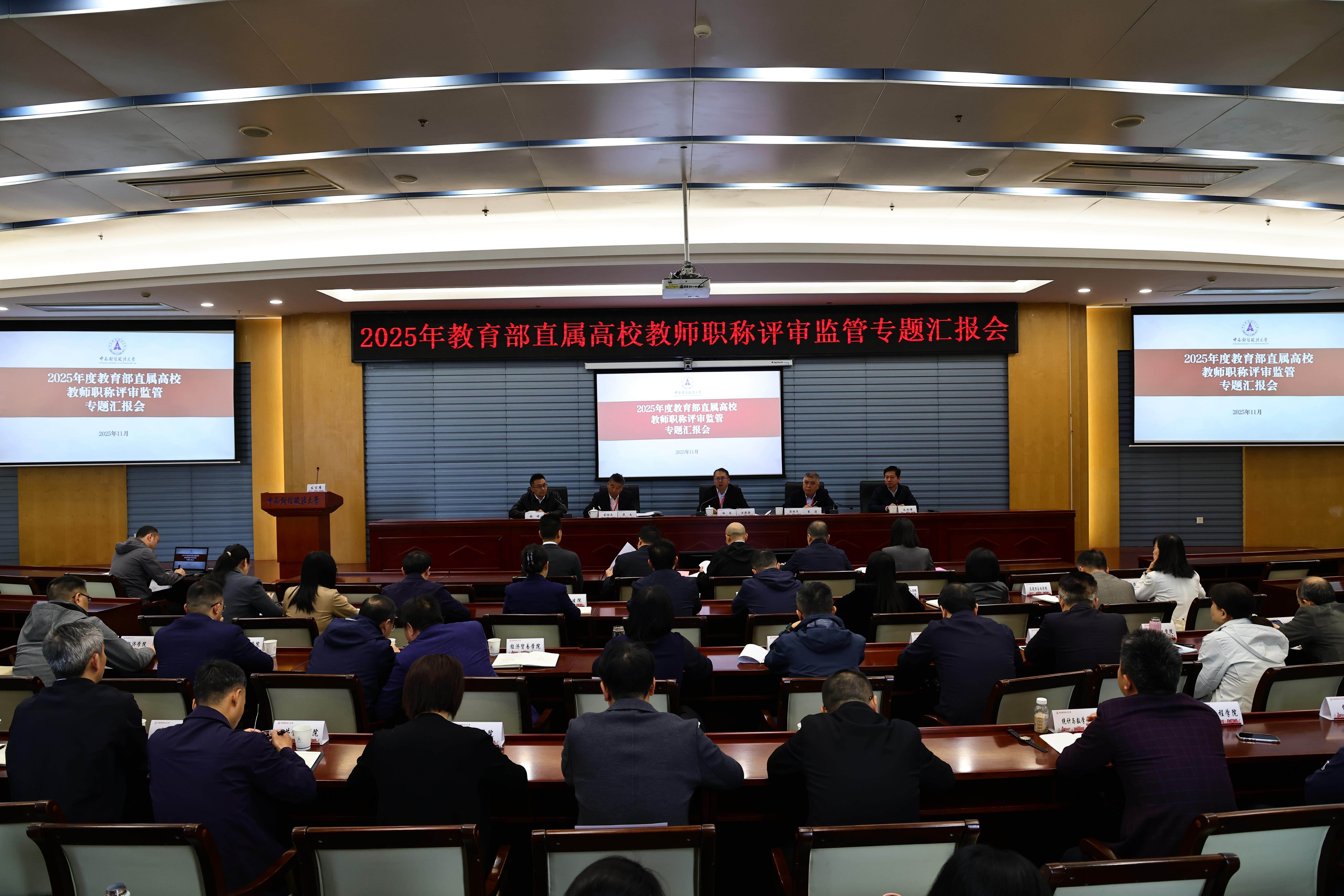 11月3日上午,学校召开教育部直属高校教师职称评审监管专题汇报会,汪源源主持会议,他介绍了开展监管工作的背景、目的以及监管内容。中南财经政法大学校长、党委副书记朱方伟教授代表学校向专家组做学校教师职称评审工作专题汇报。朱校长从打造高质量教师队伍、构建科学工作机制、推进教师评价改革、探索特色评价体系、存在不足与改进举措五个方面全面介绍学校教师职称评审工作开展情况。他表示,学校将坚持加强党对教师工作的领导,扎实推进“人才强校”战略,坚持师德师风第一标准,不断强化政治引领、纵深推进综合评价改革,逐步完善评价科学、规范有序、竞争择优的教师职称评聘制度体系,推动高素质专业化教师队伍建设,为学校事业发展提供有力的人才支撑。