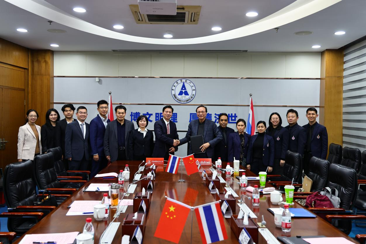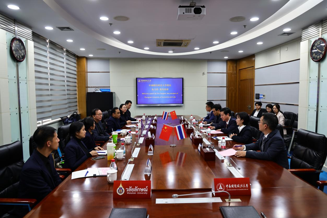 新闻网讯(通讯员 李家琪 摄影 杜鹏)2025年11月3日下午,学校与泰国瓦莱岚大学在中原楼五楼会议室举行“2+2”汉语言文学本科联合培养项目签约仪式。此次签约是两校深化国际教育合作的重要里程碑,也是我校首个来华留学“2+2”本科联合培养协议。中南财经政法大学校长、党委副书记朱方伟、国际教育学院院长郑影、新闻与文化传播学院院长余秀才,瓦莱岚大学校长颂巴·坦荣潭亚翁、副校长查伦·本亚坎等两校相关负责人出席仪式,双方就合作事宜深入交流。仪式由郑影院长主持。